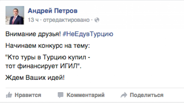 Заместитель главы Центрального района Санкт-Петербурга, председатель регионального отделения партии "РОДИНА" Андрей Петров запустил в социальных сетях конкурс на тему "Кто туры в Турцию купил – тот финансирует ИГИЛ". В нём парламентарии, госслужащие и общественные активисты сочиняют стихи, осуждающие действия турецких властей.