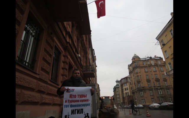 Сегодня, 25 ноября 2015 года, региональное отделение партии "РОДИНА" в Санкт-Петербурге провело серию одиночных пикетов у консульства Турции. Таким образом, социал-патриоты выразили своё возмущение по поводу действий Анкары в отношении России.