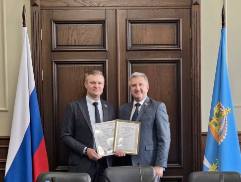 На днях заместитель Председателя Думы Астраханской области Олег Петелин вручил председателю реготделения ПАРТИИ «РОДИНА», депутату региональной Думы Владимиру Сухареву благодарственное письмо от Митрополита Астраханского и Камызякского Никона за благотворительную помощь Астраханской Епархии, помощь в виде пожертвований.